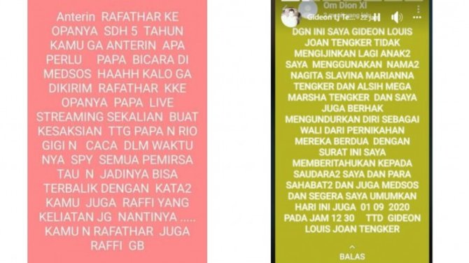 "Dengan ini saya Gideon Louis Joan Tengker (GLJT) tidak mengizinkan lagi anak-anak saya menggunakan nama Nagita Slavina Marianna Tengker dan Alsih Mega Marsha Tengker. Dan saya juga berhak mengundurkan diri sebagai wali dari pernikahan mereka berdua," bunyi tulisan dari unggahan akun FB tersebut yang kemudian diposting ulang oleh akun gosip di Instagram.