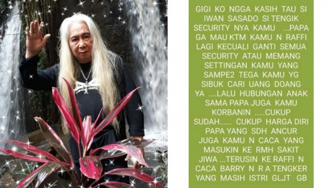 "Gigi ko ngga kasih tau si Iwan Sasado security kamu. Papa ga mau ketemu kamu dan Raffi lagi kecuali ganti semua security atau memang settingan kamu yang sampe-sampe tega kamu yang sibuk cari uang doang ya lalu hubugan anak sama papa juga kamu korbanin, cukup sudah," lanjutnya.