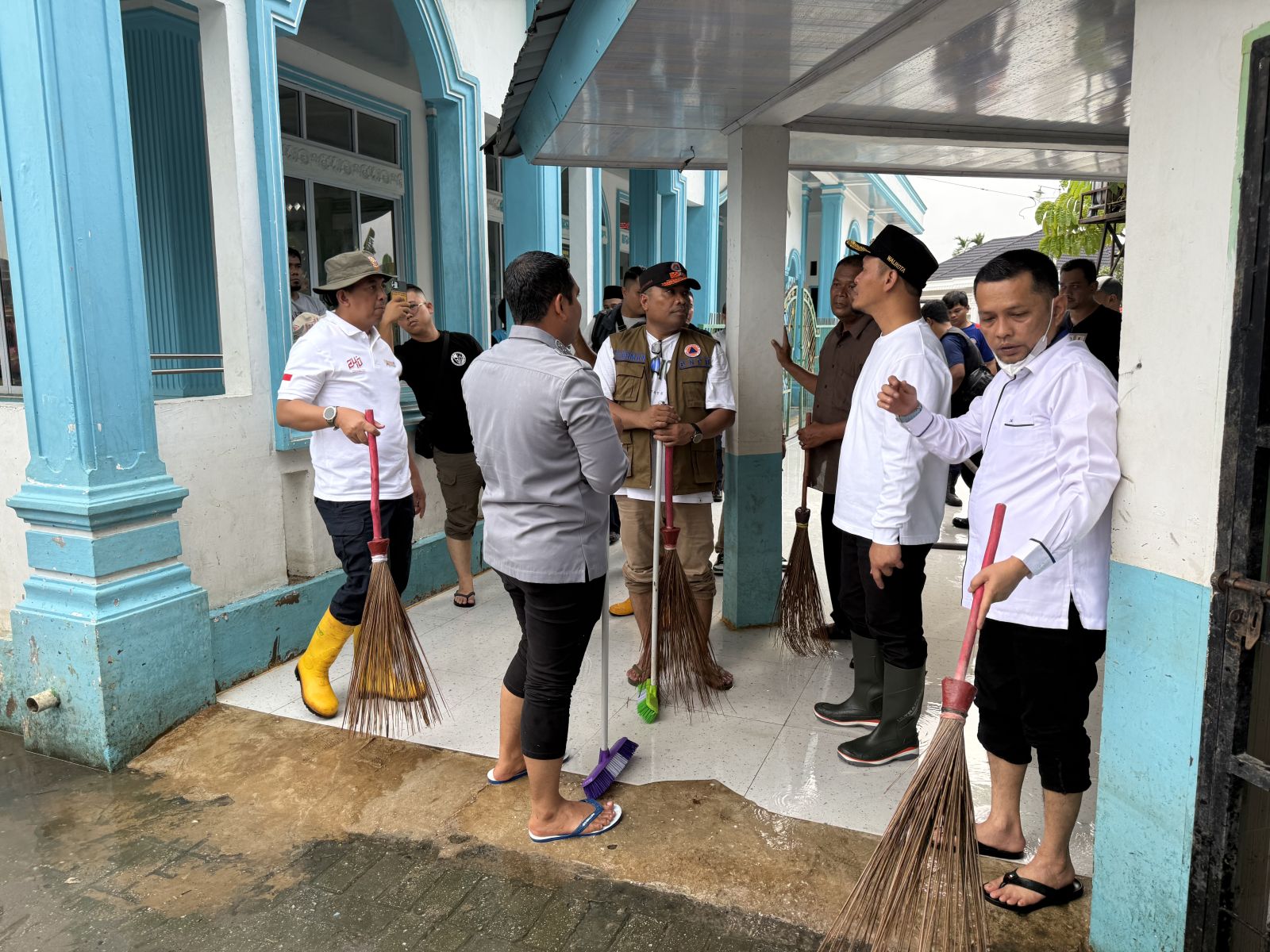 Agung mengerahkan jajarannya untuk membersihkan fasilitas umum yang terkena banjir beberapa hari kemarin. Satu diantaranya membersihkan Masjid Hijratul Haq, Kelurahan Sri Menanti.