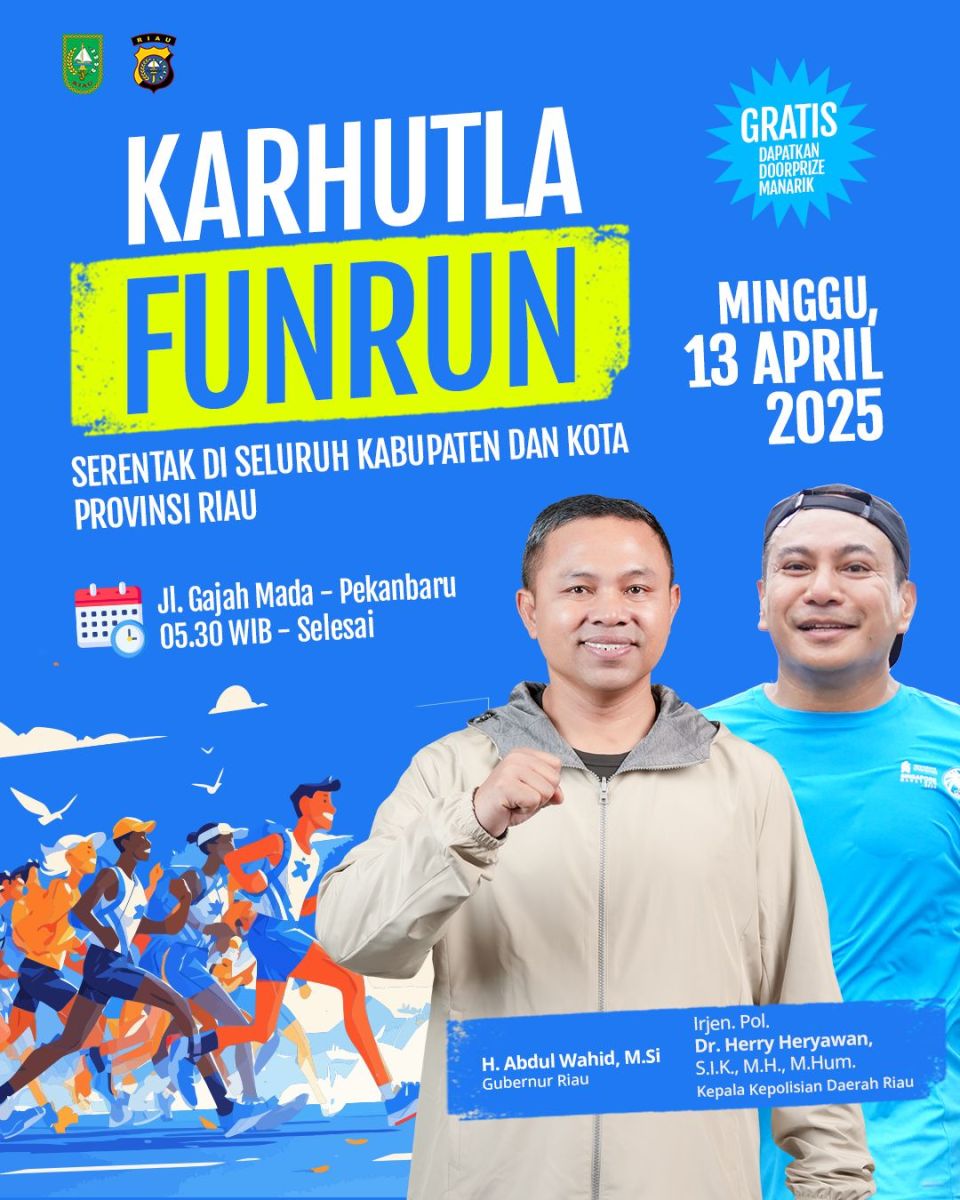 RIAU (RA) - Pemerintah Provinsi (Pemprov) Riau bersama Kepolisian Daerah (Polda) Riau menggelar Karhutla Fun Run 2025 sebagai bagian dari edukasi dan sosialisasi potensi bahaya kebakaran hutan dan lahan (Karhutla) yang diprediksi meningkat tahun ini akibat cuaca ekstrem.