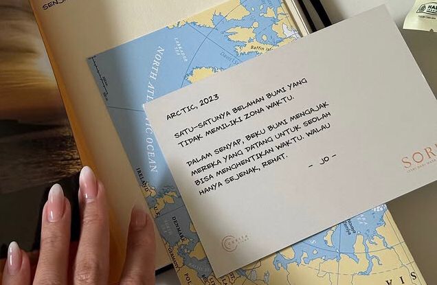Salah satu quote dari Jonathan tentang Arctic berbunyi “Satu-satunya belahan bumi yang tidak memiliki zona waktu. Dalam senyap, beku bumi mengajak mereka yang datang untuk seolah bisa menghentikan waktu. Walau hanya sejenak, rehat.”
