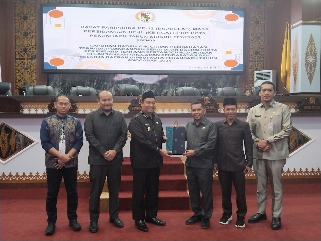 PEKANBARU (RA) - DPRD Kota Pekanbaru akhirnya mengesahkan Rancangan Peraturan Daerah (Ranperda) tentang Pertanggungjawaban Pelaksanaan APBD Tahun Anggaran 2024 dalam rapat paripurna yang digelar di Gedung Balai Payung Sekaki, Kamis malam (31/7/2025).
