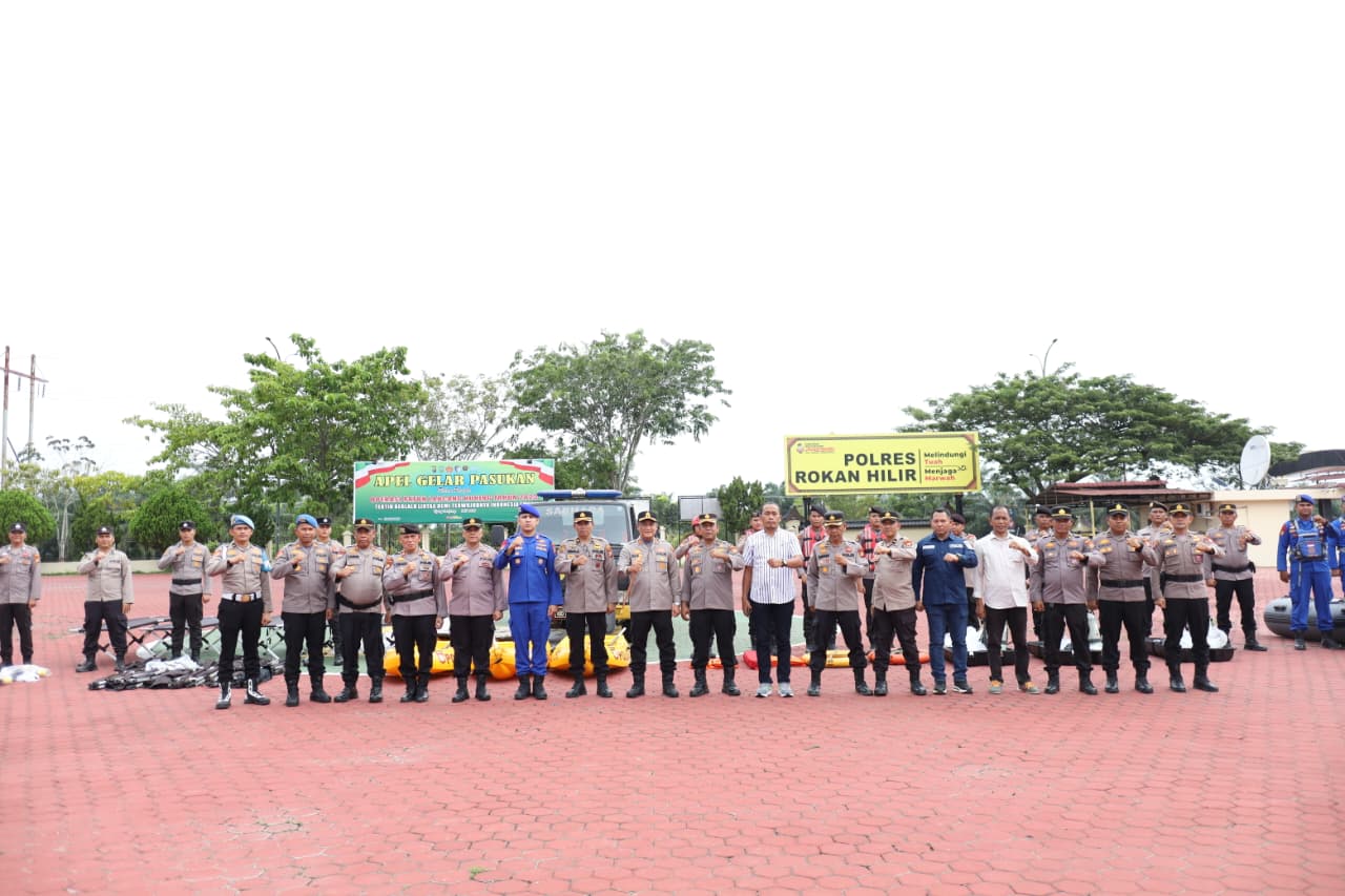 ROHIL (RA) - Musim penghujan mulai melanda sejumlah wilayah di Provinsi Riau. Mengantisipasi potensi bencana banjir, Kepolisian Resor Rokan Hilir (Polres Rohil) melakukan langkah sigap dengan melakukan pengecekan sarana, prasarana, serta kesiapan personel.