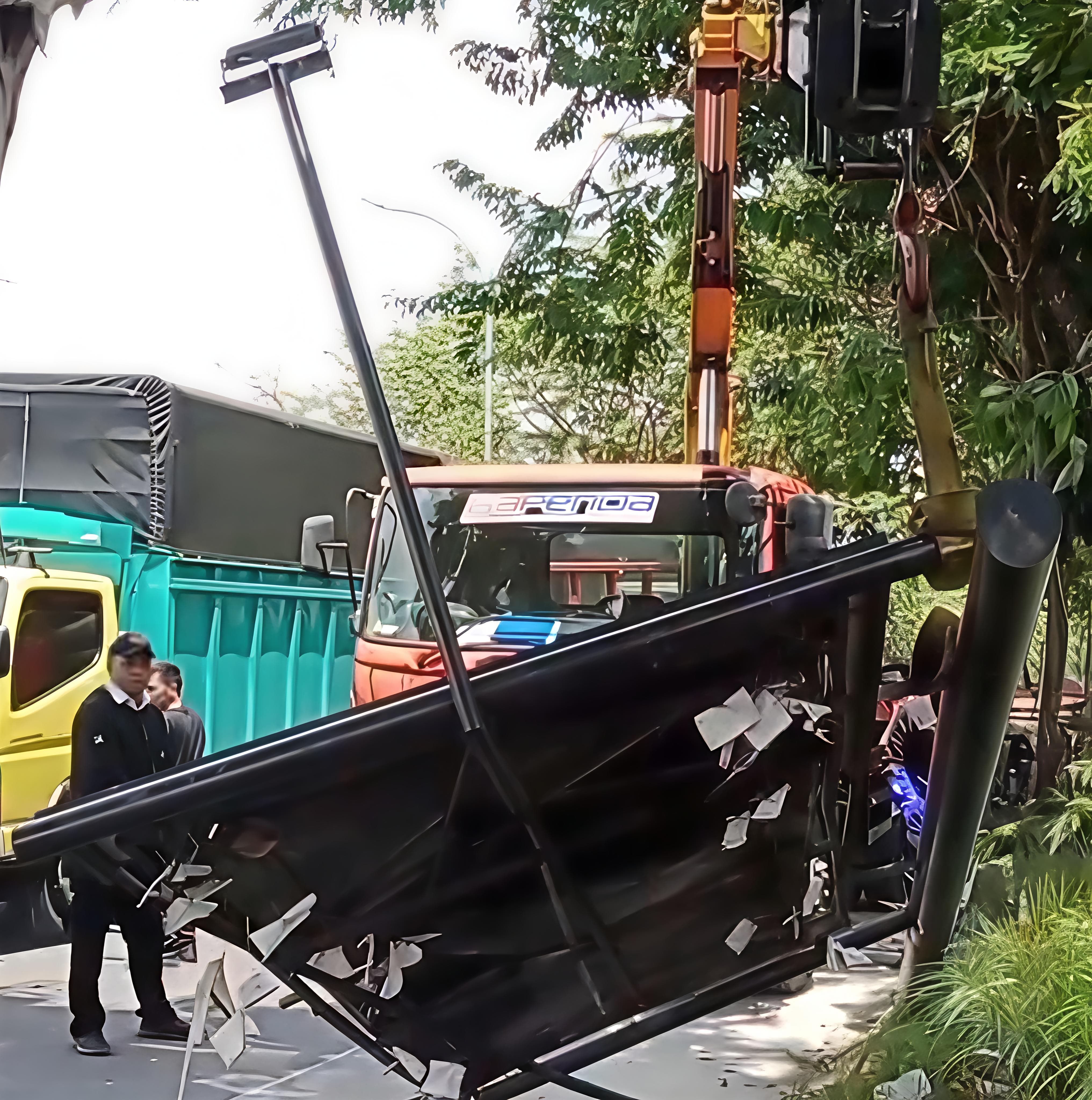 Pembongkaran dilakukan terhadap tiang reklame yang berdiri di area hijau, tepat sebelum tanjakan flyover Mall Living World.