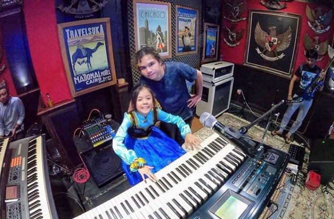 Safeea yang mengenakan gaun berwarna biru tua tampak seperti gadis dewasa yang bergaya ala musisi sambil memegang keyboard. Sedangkan Dul Jaelani mengenakan kaos santai berdiri di sampingnya dengan gaya rambut gondrong yang terikat.
