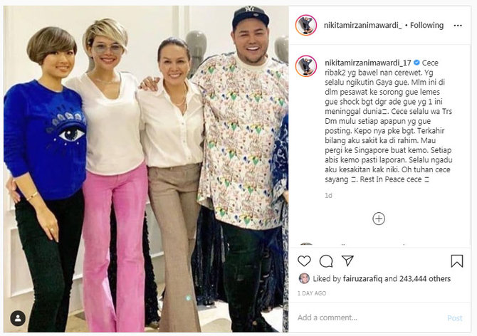 "Cece ribak2 yang bawel dan cerewet. Yg selalu ngikutin gaya gue. Malam ini di dalam pesawat ke Sorong gue lemes gue shock banget denger adek gue yang satu ini meninggal dunia. Terakhir bilang aku sakit di rahim. Mau pergi ke Singapura buat kemo. Setiap abis kemo pasti laporan.Selalu ngadu aku kesakitan Kak Niki. Oh Tuhan Cece sayang. Rest ini peace Cece," jelas Nikita.