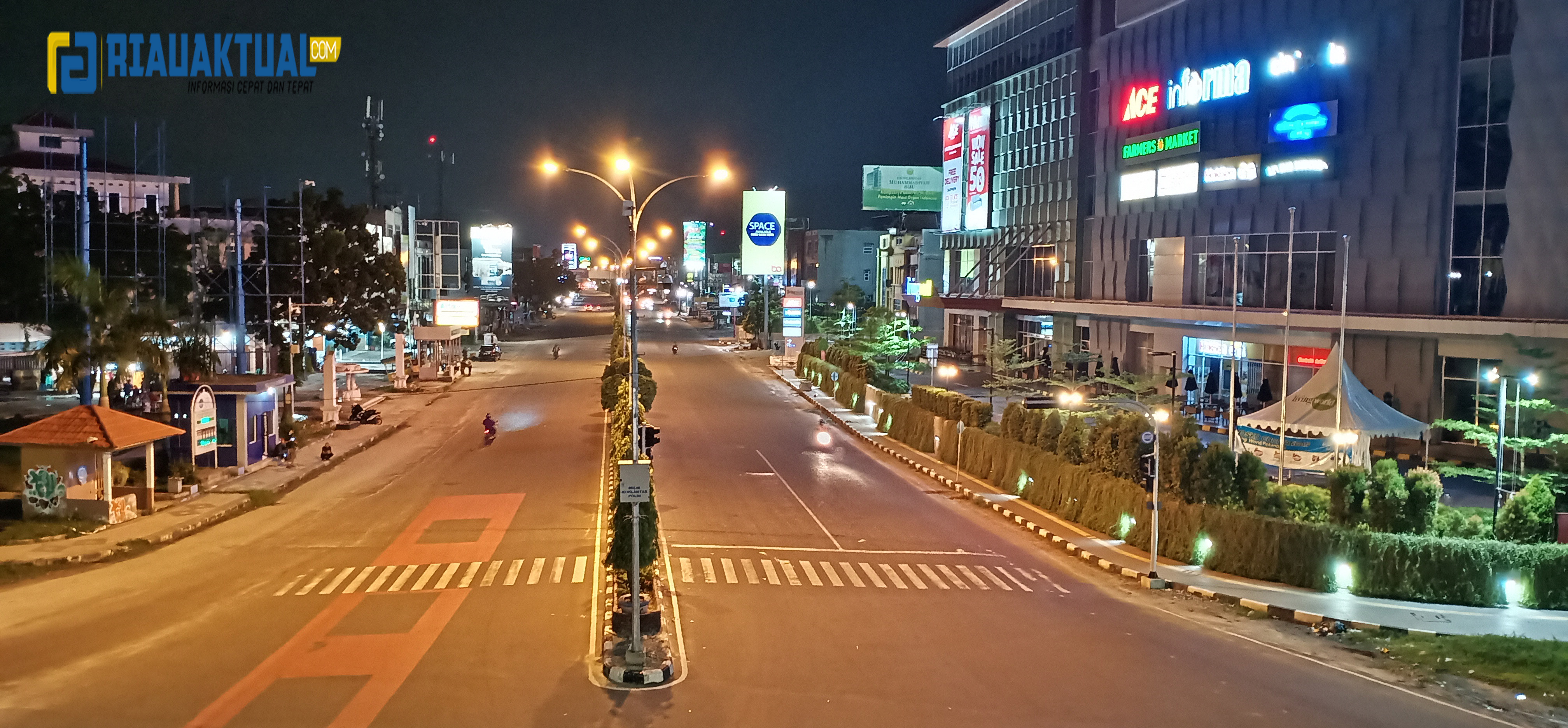 Terpantau pada pukul 21.00 WIB pasca mulai diberlakukan pada pukul 20.00 WIB suasana Kota Pekanbaru relatif sepi dari segala macam aktifitas.