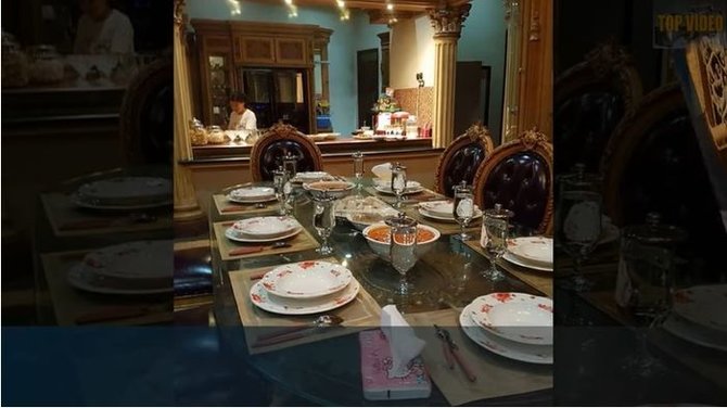 Ruang makan Muzdalifah juga dipenuhi dengan furnitur mewah. Meja kaca yang besar dan kursi kayu berwarna coklat tampak memenuhi ruangan.