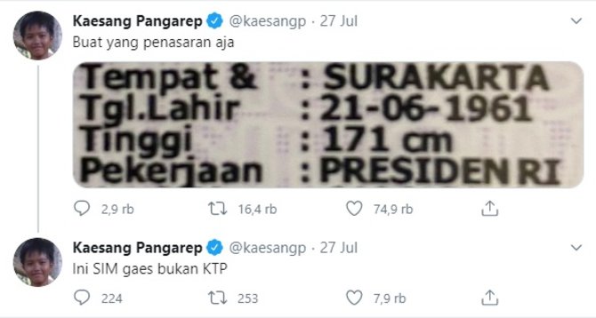 Dalam cuitannya di akun twitter @kaesangp, dirinya mengunggah sebuah foto yang memperlihatkan Surat Izin Mengmudi (SIM) yang disebut milik Bapaknya, Presiden Joko Widodo.