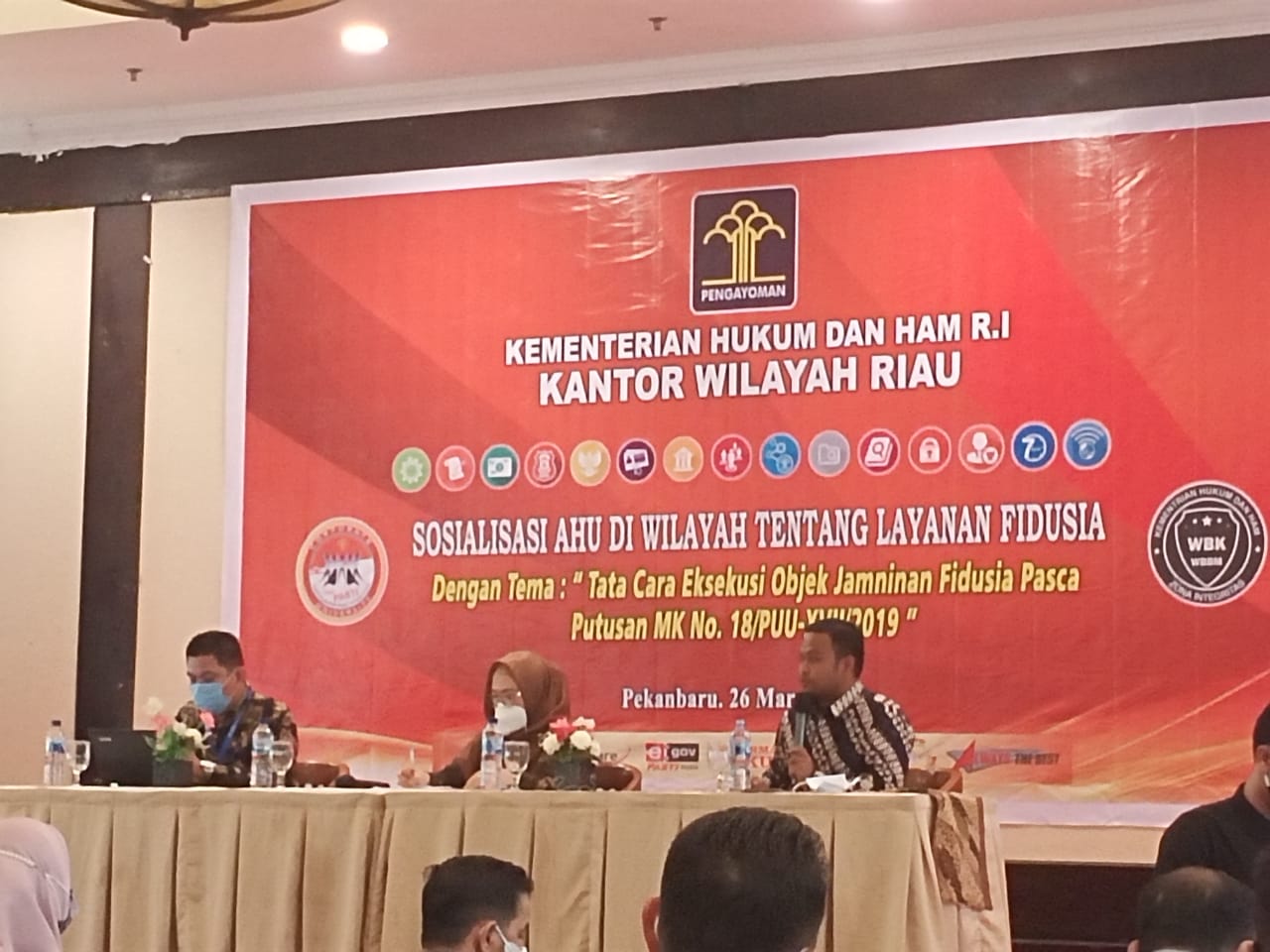 Riauaktual.com - Kanwil Kementerian Hukum Dan HAM (Kemenkumham) Riau melakukan sosialisasi guna meningkatkan pemahaman kepada instansi terkait terhadap pelaksanaan Undang-undang No.42 tahun 1999 tentang Jaminan Fidusia pasca putusan MK No.18/PUU-XVII/2019 di salah satu hotel di Pekanbaru, Jum'at (26/3/2021).