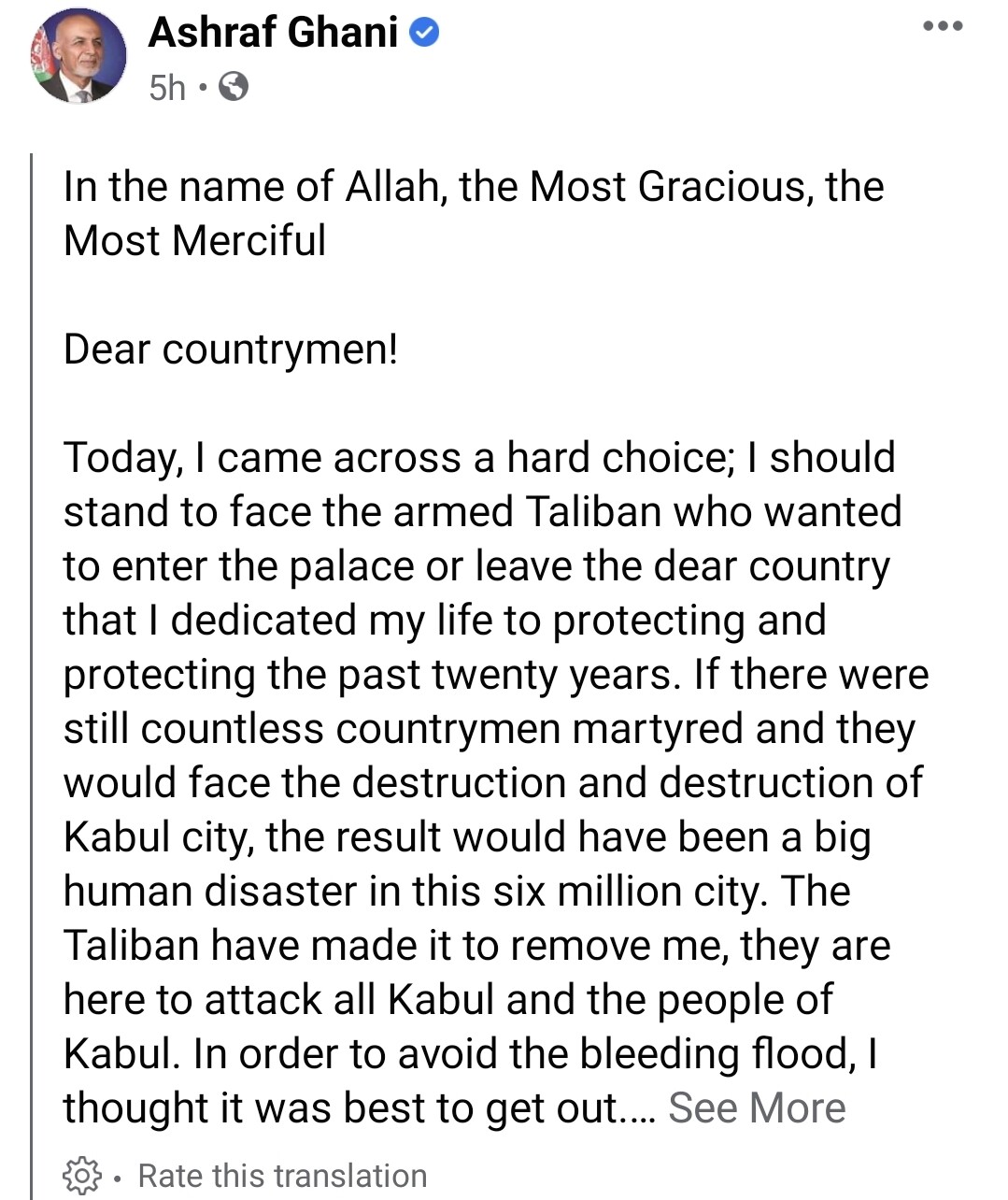 “Hari ini, saya menemukan pilihan yang sulit. Apakah saya harus berdiri menghadapi Taliban bersenjata, yang ingin memasuki istana. Atau meninggalkan negara tercinta, yang merupakan tempat saya mendedikasikan hidup selama 20 tahun terakhir," imbuhnya.