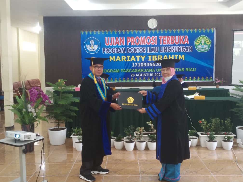 Dalam gelaran yang berlangsung hikmat dengan sejumlah penguji harus mengikuti acara secara virtual itu, Mariaty Ibrahim mengajukan disertasi berjudul "Model Revitalisasi Kebijakan Pembangunan Masyarakat Bagian Hulu Bantaran Sungai Siak".
