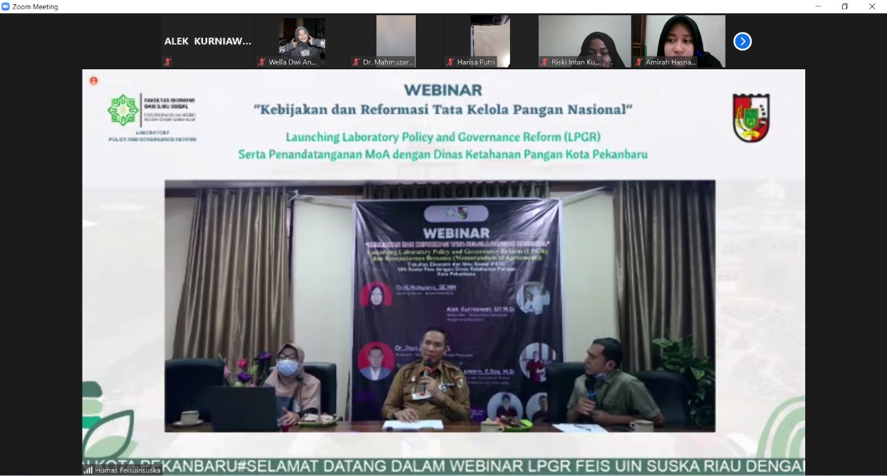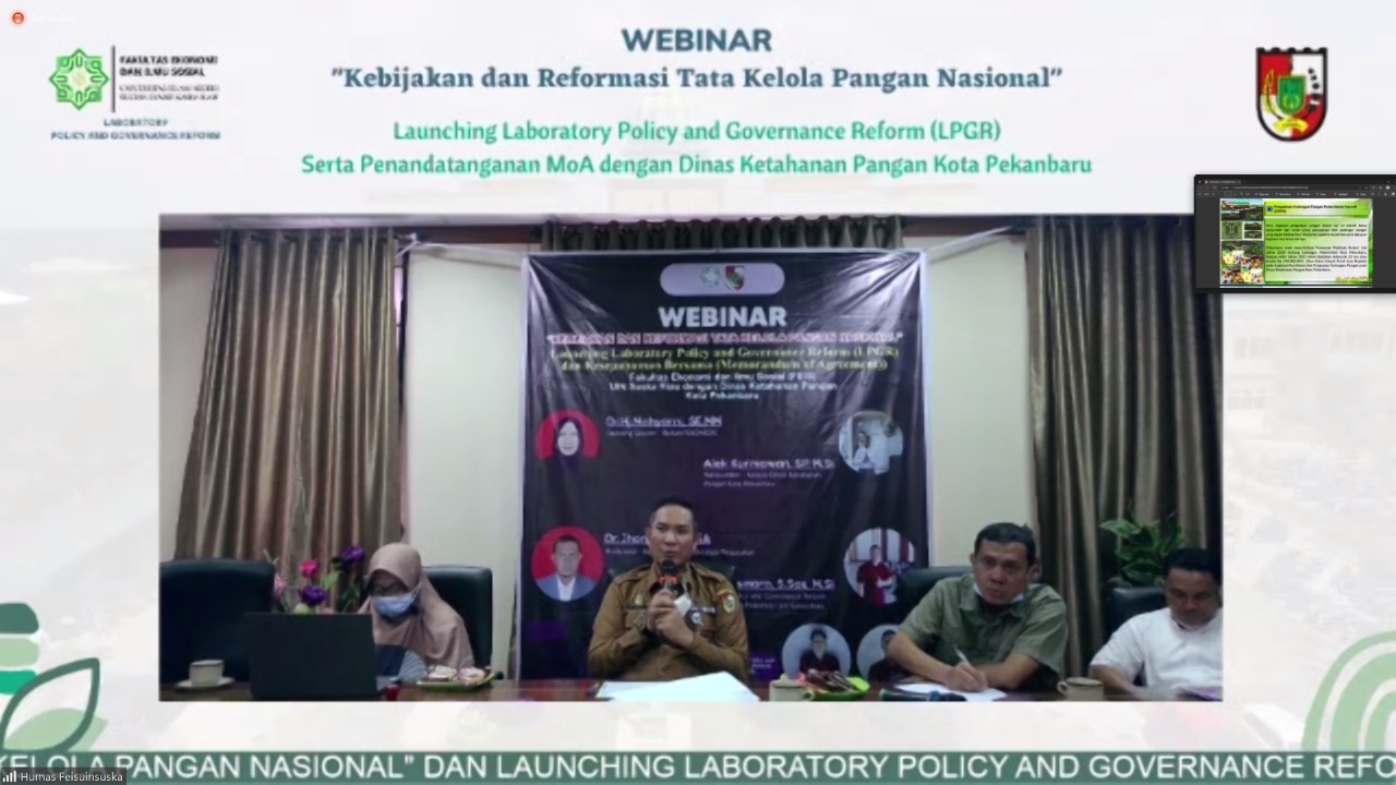 Acara yang ditaja di Fakultas Ekonomi dan Sosial Universitas Islam Negeri Sultan Syarif Kasim Riau bertajuk “ WEBINAR NASIONAL: Kebijakan dan Tatakelola Ketahanan Pangan Nasional” dengan mendaulat Alek Kurniawan, SP, M.Si yang termutakhir dikenal dengan sapaan Kadis Akur selaku Kepala Dinas Ketahanan Pangan sebagai narasumber dalam acara tersebut. Giat ini turut dihadiri oleh Dekan Fakultas Ekonomi dan Sosial Universitas Islam Negeri Sultan Syarif Kasim Riau, Dr. Hj. Mahyarni, SE, MM, Ketua Prodi Administrasi Perpajakan, Dr. Jhon Afrizal, MA selaku moderator dan Ketua Laboratory For Policy and Governance Reform Prodi Administrasi Negara Fekonsos UIN SUSKA Riau, Candra Jon Asmara, S.Sos, M.Si. Acara ini juga didukung penuh oleh Organisasi DEMA FEKONSOS yang diketuai Auliya Rahmat Ritonga dan Wakilnya Roby Suchandra. Acara ini juga diikuti secara daring oleh hampir 200-an mahasiswa prodi Administrasi Negara FEKONSOS UIN SUSKA RIAU.