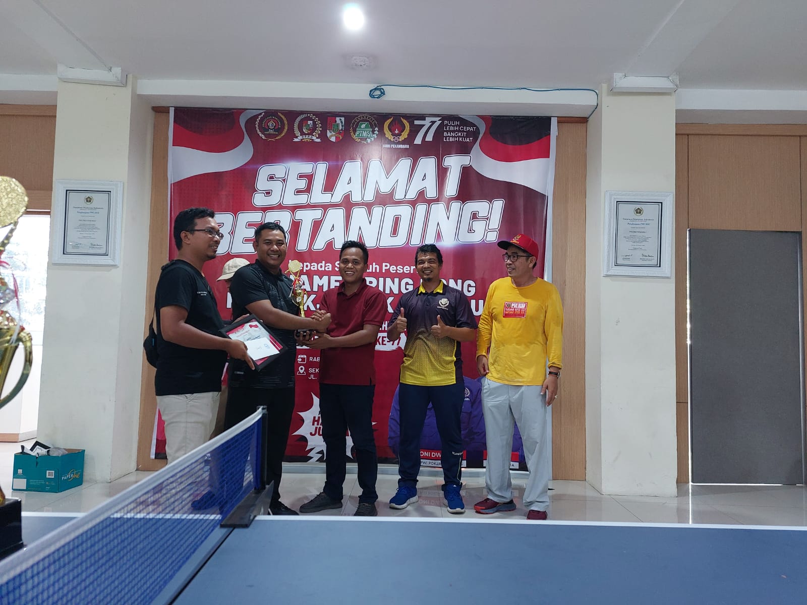 Setelah melewati sejumlah babak pertandingan, pemenang Turnamen Pingpong PWI Pokja Pekanbaru, untuk juara 1 diraih Raja Isyam Azwar, juara 2 Nurmadi, juara 3 Syawal.