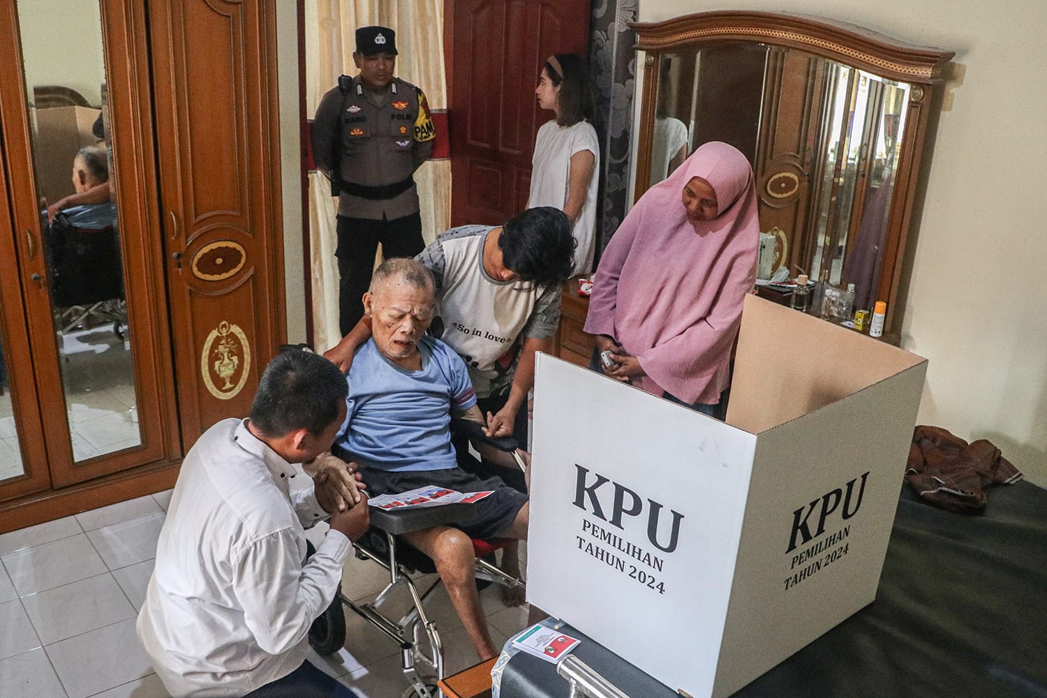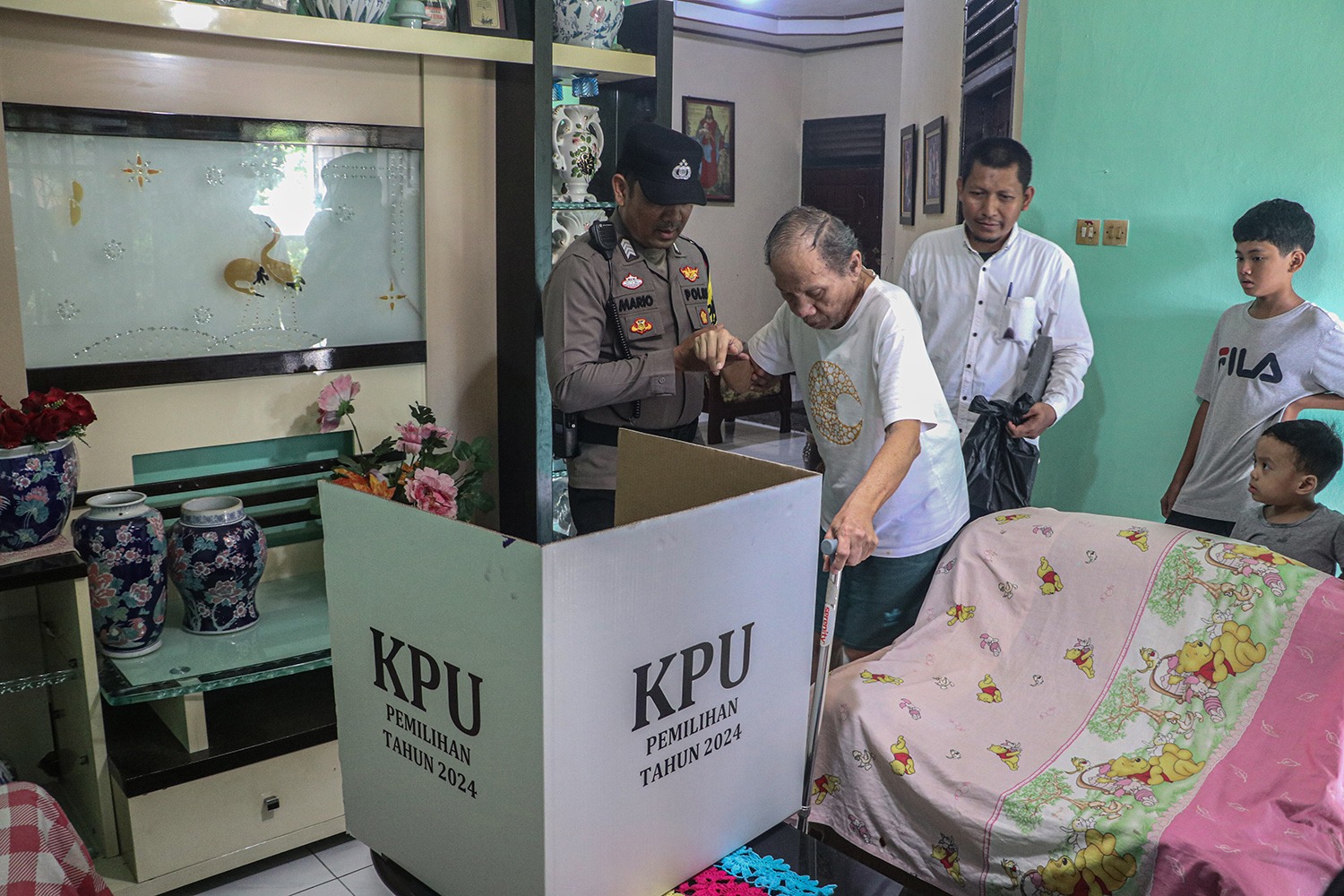 Anggota polisi membantu warga sakit untuk menggunakan hak pilihnya saat pelayanan pemungutan suara jemput bola ke rumah warga di Kelurahan Tangkerang Labuai, Kecamatan Bukit Raya, Kota Pekanbaru, Rabu (27/11/2024). Petugas KPPS mengunjungi rumah warga yang tidak dapat hadir ke TPS karena sakit agar tetap bisa memberikan hak suara di Pilkada Serentak 2024 di Provinsi Riau. (WAHYUDI)