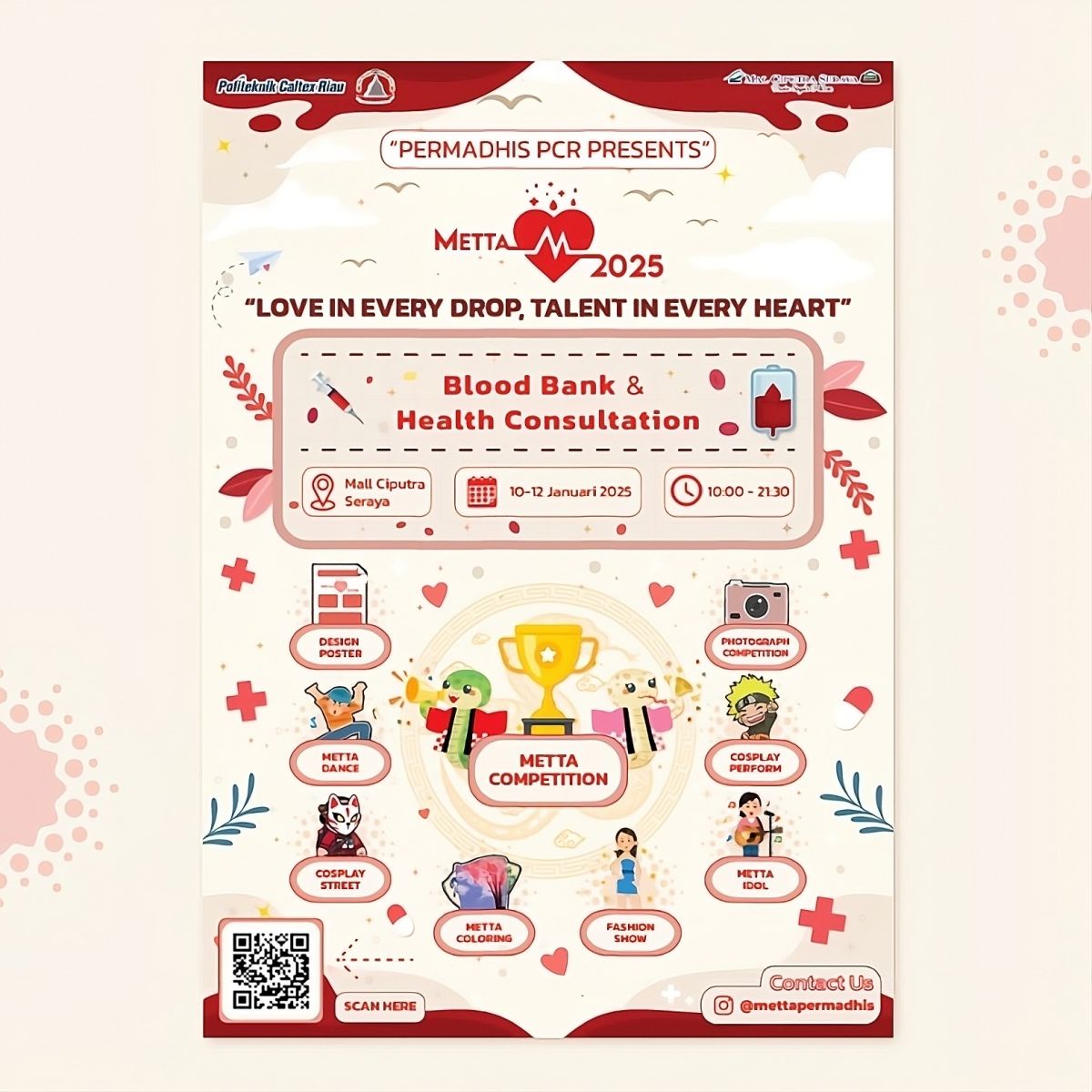 PEKANBARU (RA) – Event tahunan Metta PERMADHIS akan kembali hadir pada 10 hingga 12 Januari 2025 di Mall Ciputra Seraya, Pekanbaru. Tahun ini, acara tersebut mengusung tema “Love in Every Drop, Talent in Every Heart”, menyoroti pentingnya kasih sayang dan kontribusi positif dalam kehidupan sehari-hari.