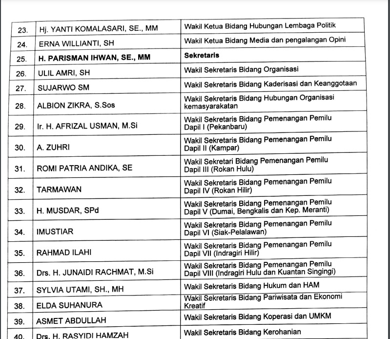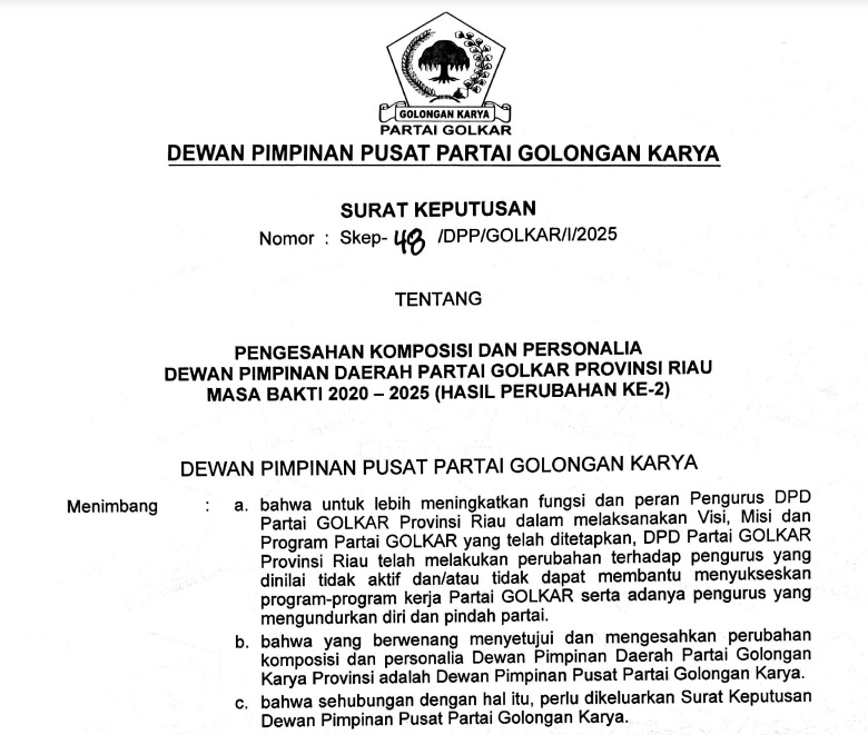 Dalam SK dengan nomor Skep-48/DPP/Golkar/2025 itu tertera Ketua DPD I Golkar Riau masih dipegang oleh Syamsuar namun Sekretaris yang mulanya diisi oleh Indra Gunawan Eeet telah berubah menjadi Parisman Ihwan.