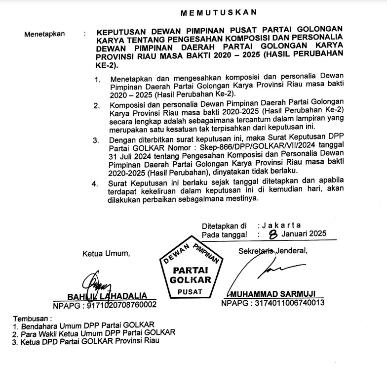 "Menetapkan dan mengesahkan komposisi dan personalia DPD Partai Golkar Provinsi Riau masa bakti 2020-2025 hasil perubahan ke-2. Dengan diterbitkan surat keputusan ini, maka surat keputusan DPP Partai Golkar nomor Skep-866/DPP/Golkar/VII/2024 tanggal 31 Juli 2024 tentang pengesahan komposisi dan personalia DPD Golkar Provinsi Riau sebelumnya dinyatakan tidak berlaku," bunyi surat tersebut.