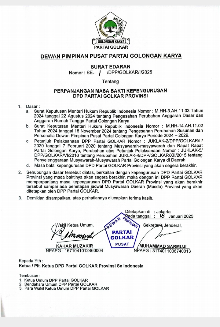 Surat Edaran perpanjangan ini ditandatangani oleh Wakil Ketua Umum DPP Golkar Kahar Muzakir dan Sekretaris Jenderal DPP Golkar Muhammad Sarmuji, Kamis (16/1/2025). Surat ini berlaku untuk seluruh DPD I Golkar se-Indonesia dan sudah disampaikan kepada Ketua maupun Plt Ketua DPD I Golkar.