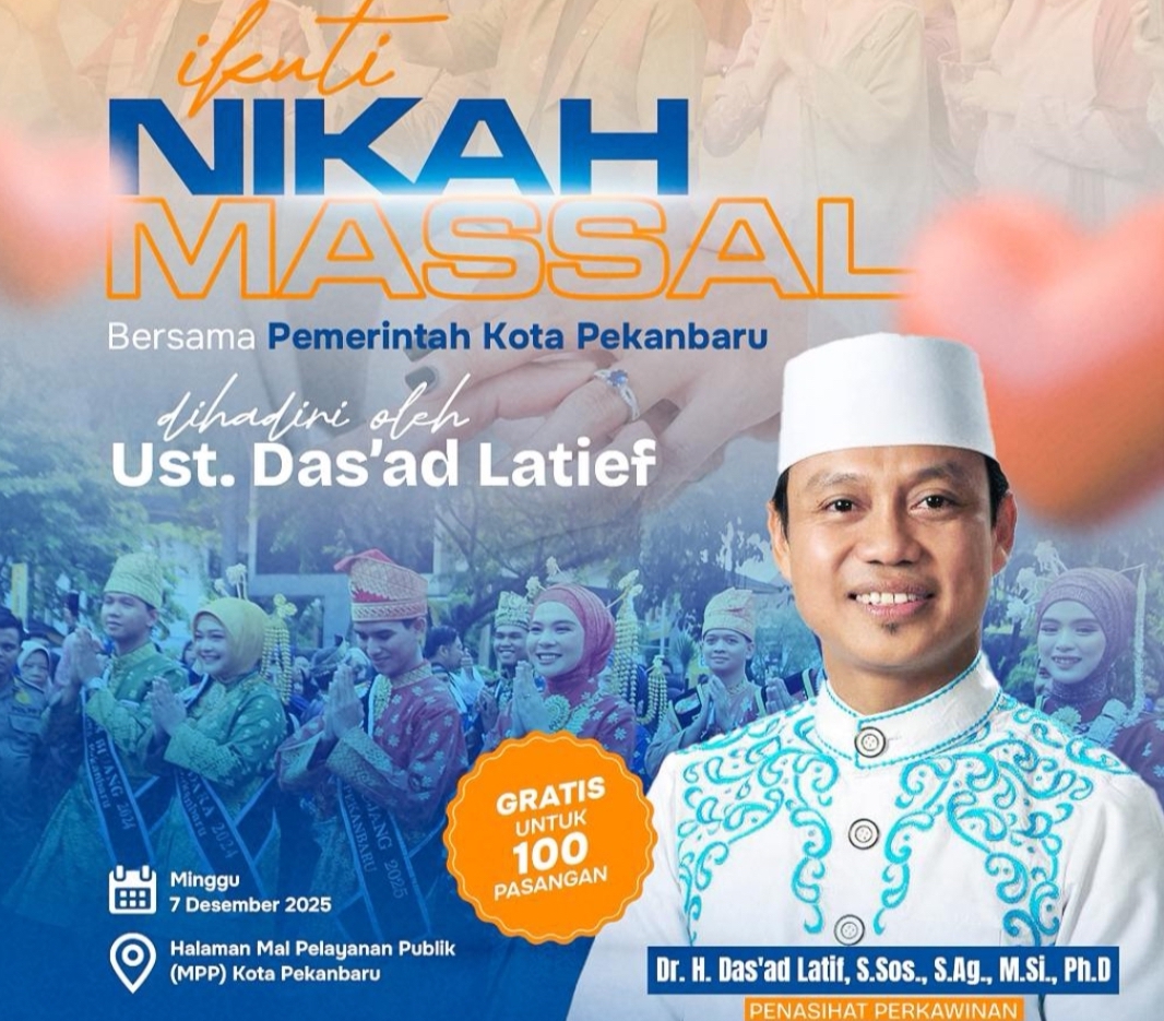 Ustadz kondang ini, dijadwalkan bakal menjadi penasihat perkawinan pada kegiatan tersebut. Kegiatan tersebut bakal berlangsung di halaman Mal Pelayanan Publik (MPP) Pekanbaru, pada 7 Desember 2025.