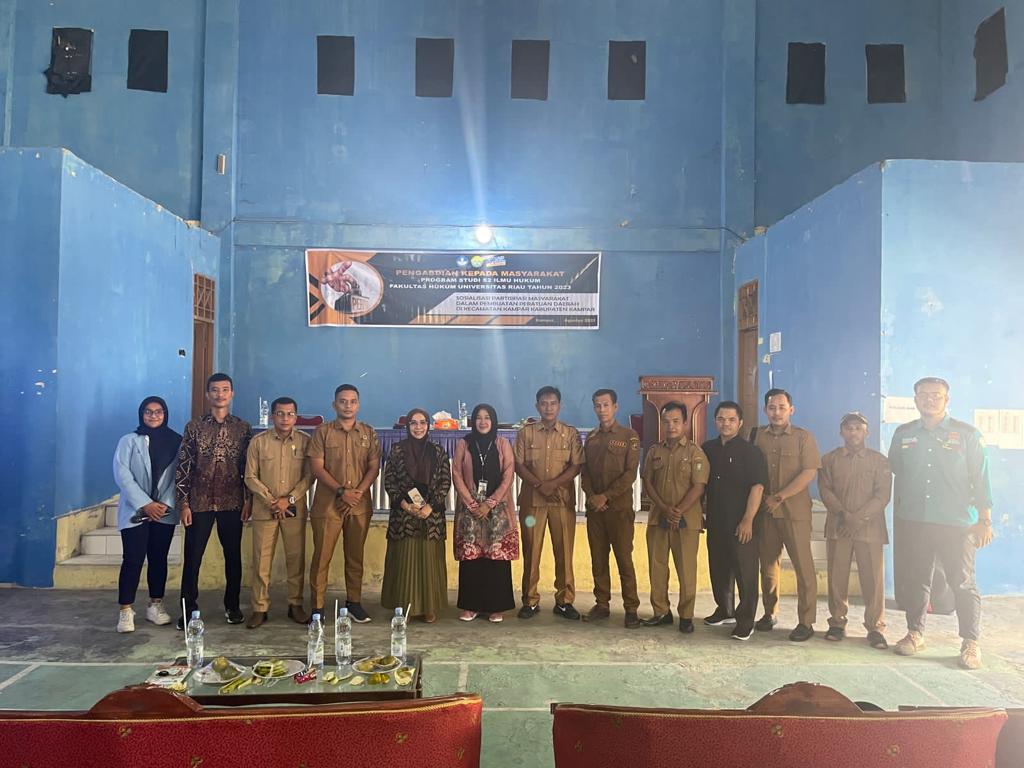Kegiatan ini diadakan pada hari Senin, 28 Agustus 2023 lalu, di Aula Kantor Camat Kampar, tepatnya di Air Tiris. Acara ini dihadiri oleh Dosen dan Mahasiswa Program Studi S2 Ilmu Hukum FH UNRI serta dihadiri oleh para kepala desa dan ketua Badan Permusyawaratan Desa (BPD) di Kecamatan Kampar.