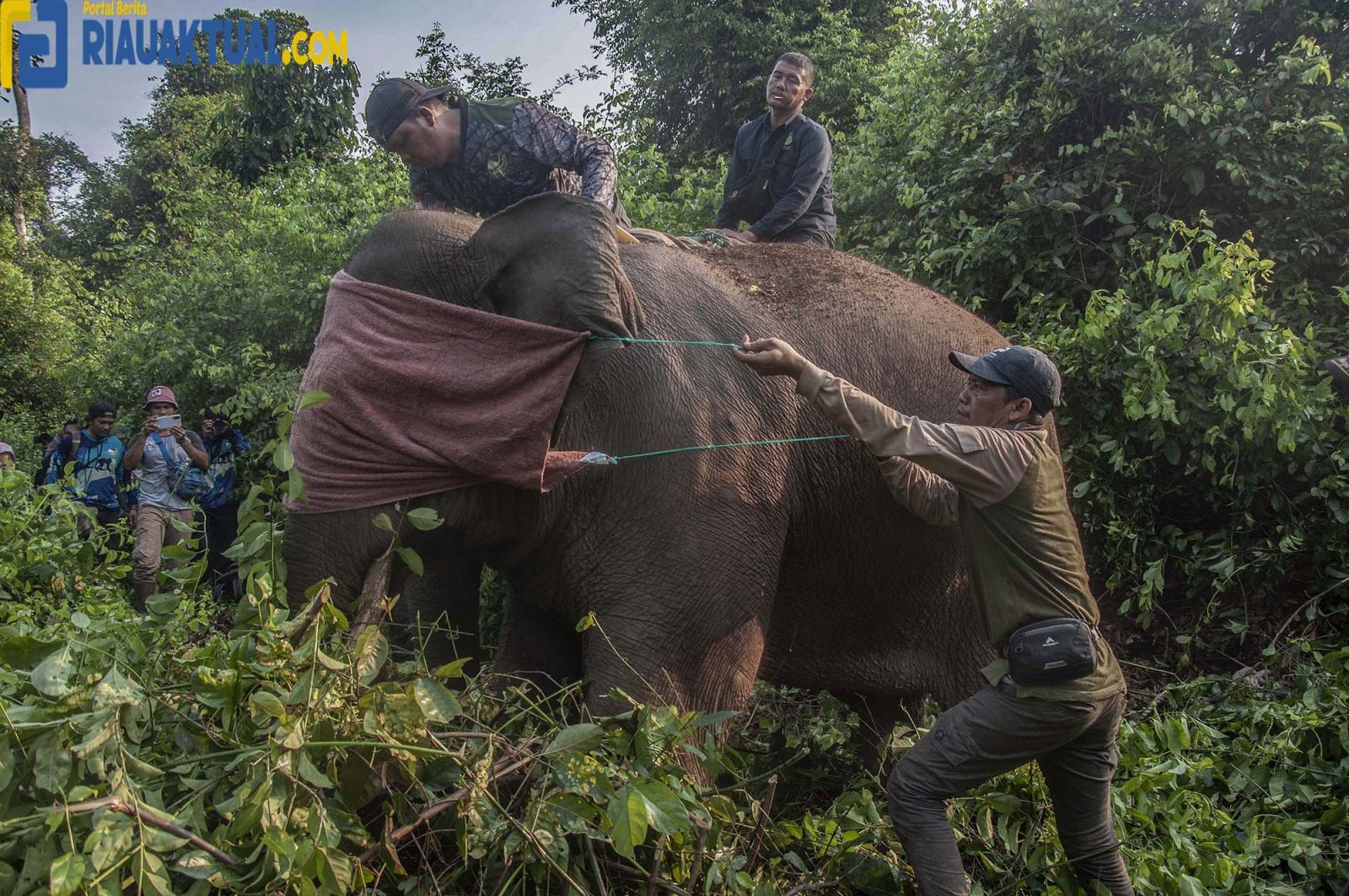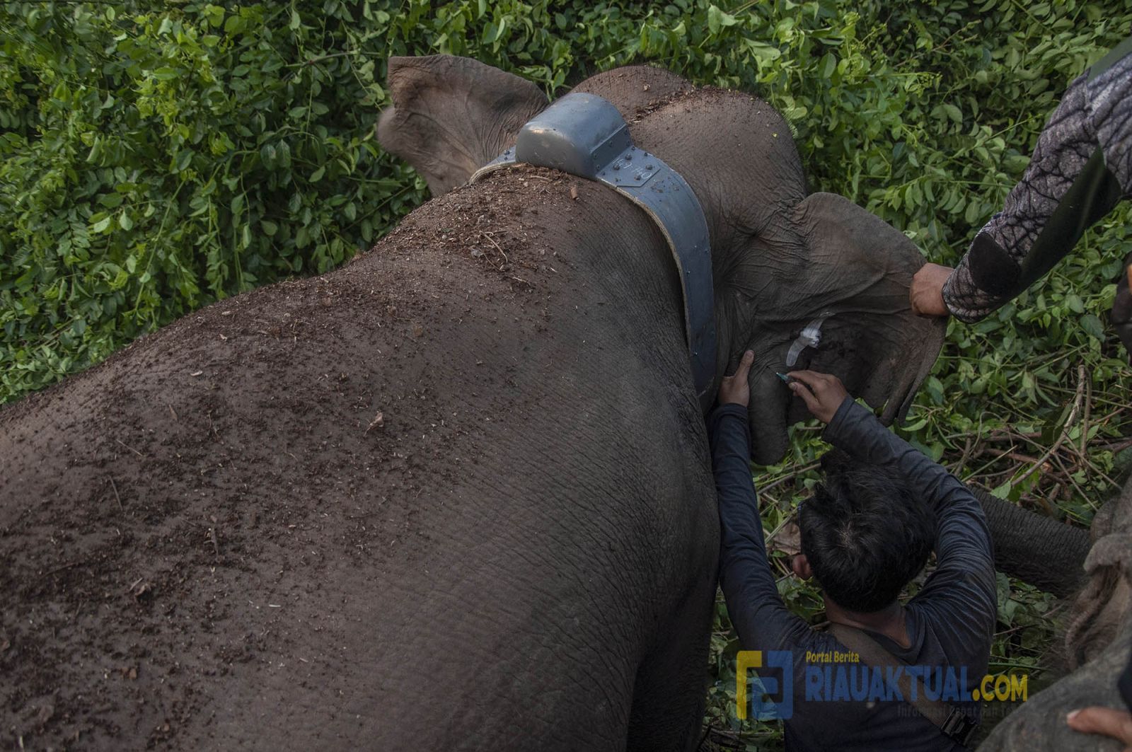 Seekor gajah sumatera liar jantan berumur estimasi 15 tahun dengan berat 2 ton yang menjadi target pemasangan GPS Collar telah tertembak bius di kawasan Hutan konservasi Kecamatan Pangkalan Lesung, Kabupaten Pelalawan, Provinsi Riau pada 07 Oktober 2023. (WAHYUDI).jpg)
