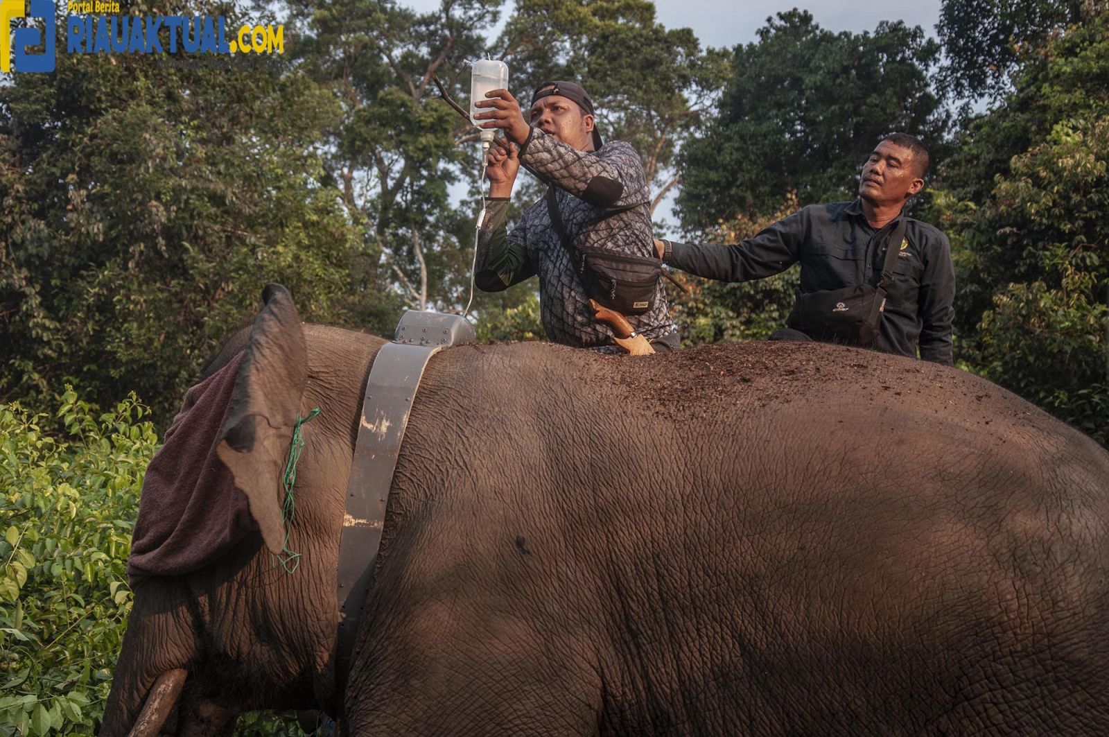 Petugas Balai Besar Konservasi Sumber Daya Alam (BBKSDA) Riau memberikan cairan infus pada gajah sumatera liar jantan berumur estimasi 15 tahun dengan berat 2 ton yang telah terpasang GPS Collar di kawasan hutan konservasi Kecamatan Pangkalan Lesung, Kabupaten Pelalawan, Provinsi Riau pada 07 Oktober 2023. (WAHYUDI)
