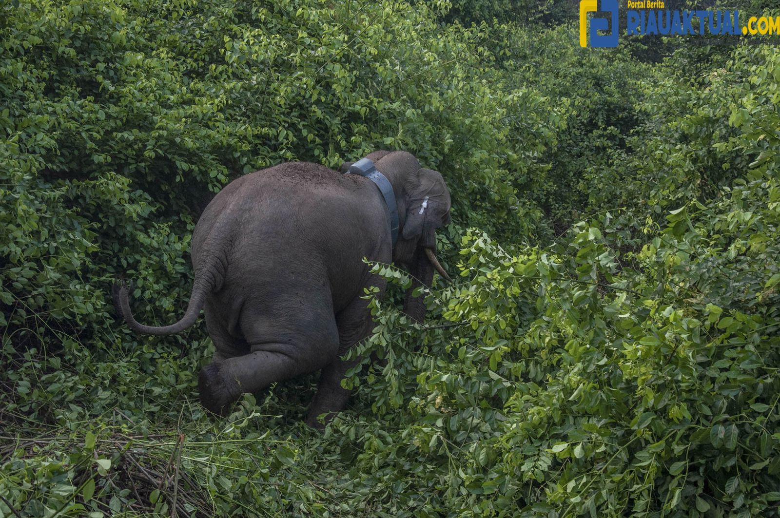 Gajah sumatera liar jantan berumur estimasi 15 tahun dengan berat 2 ton yang telah terpasang GPS Collar berlari kedalam kawasan hutan konservasi Kecamatan Pangkalan Lesung, Kabupaten Pelalawan, Provinsi Riau pada 07 Oktober 2023. (WAHYUDI)