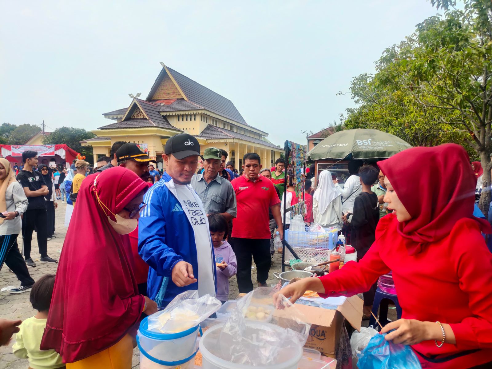 Agung Nugroho, yang didampingi oleh istrinya, Hj Sulastri, berkeliling menyapa para pedagang sambil membeli berbagai makanan dan minuman yang dijual. Dagangan seperti pisang molen, es krim, bakso bakar, es tebu, dan kerupuk opak diborong oleh Agung untuk kemudian dibagikan kepada masyarakat yang hadir.